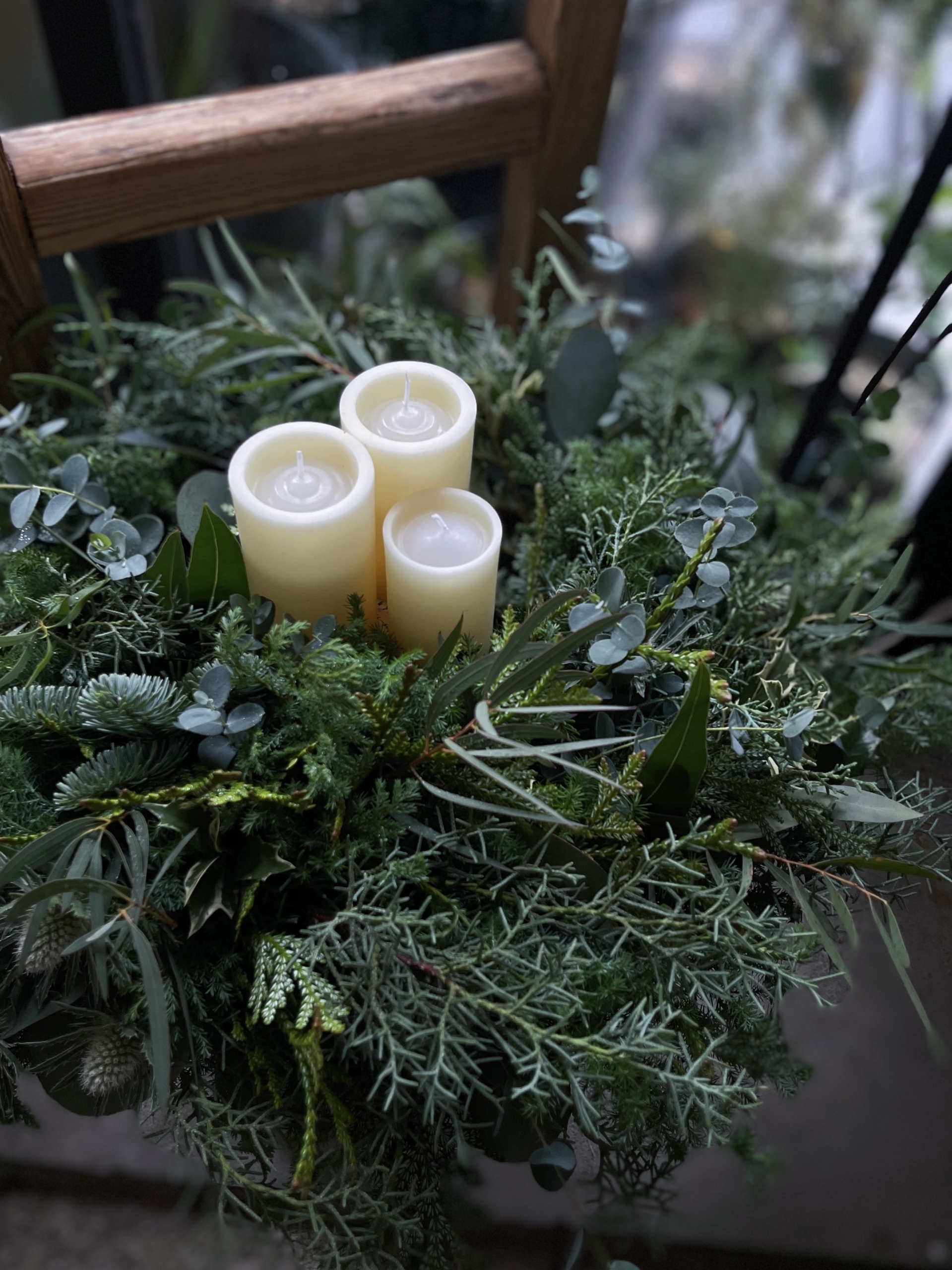 基本的にはクリスマスまでではなく、冬の間中楽しんでいただけるように数種類のグリーンでお作りします。