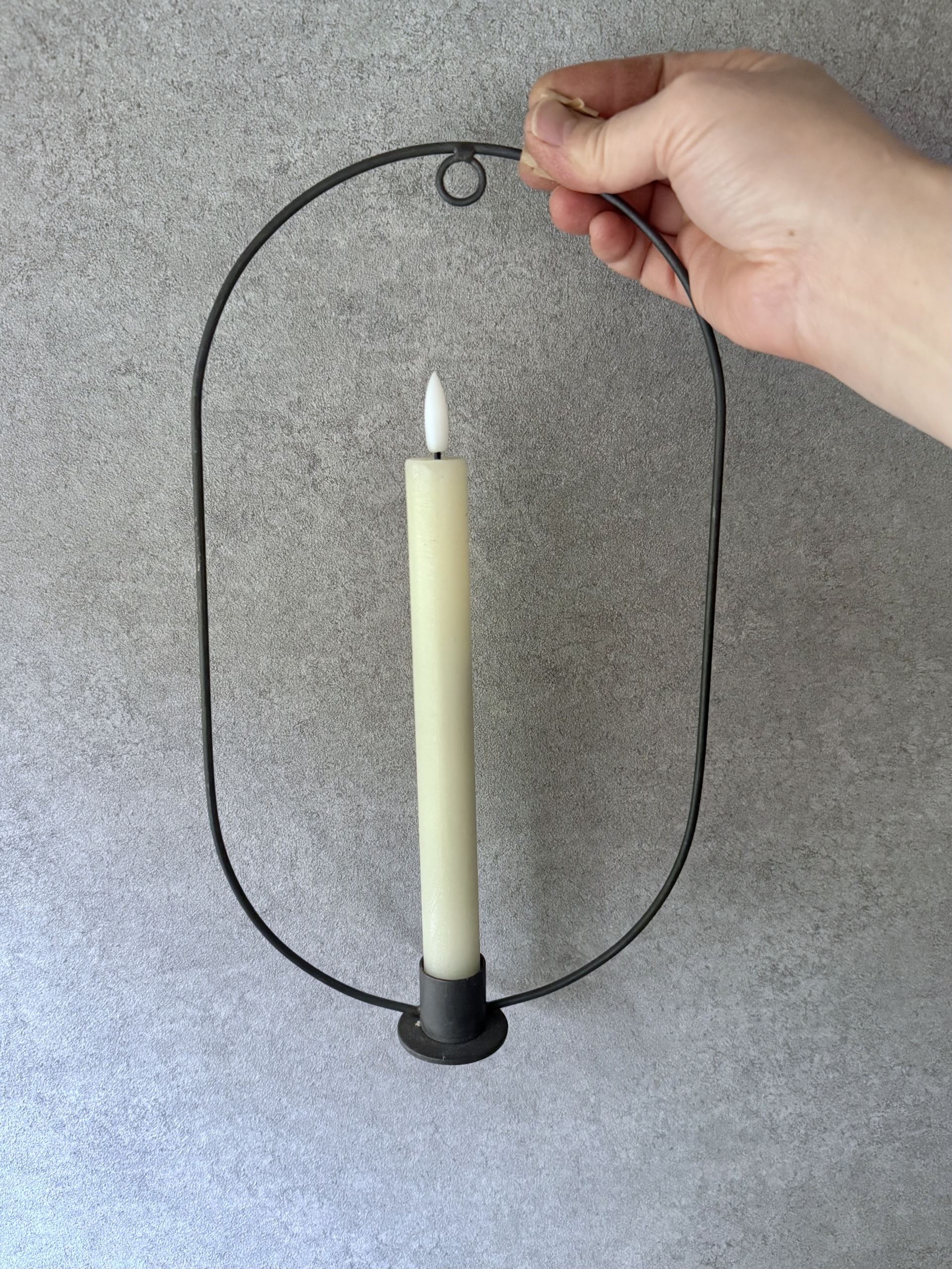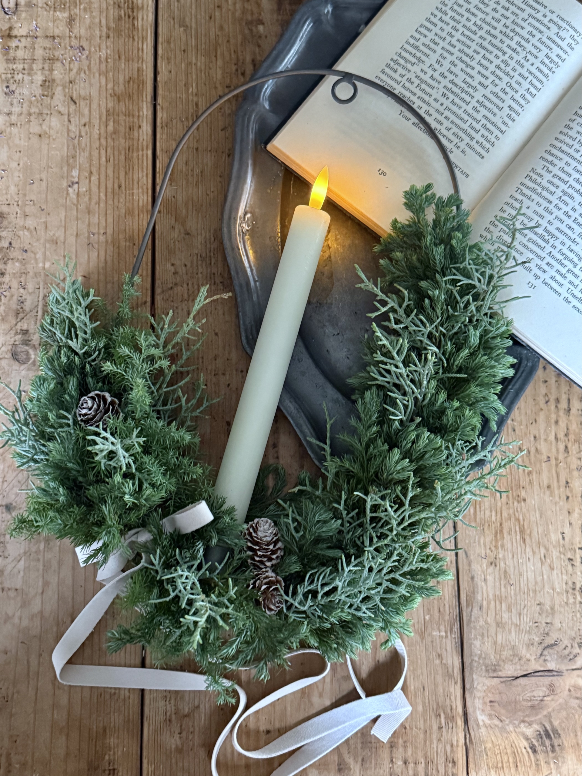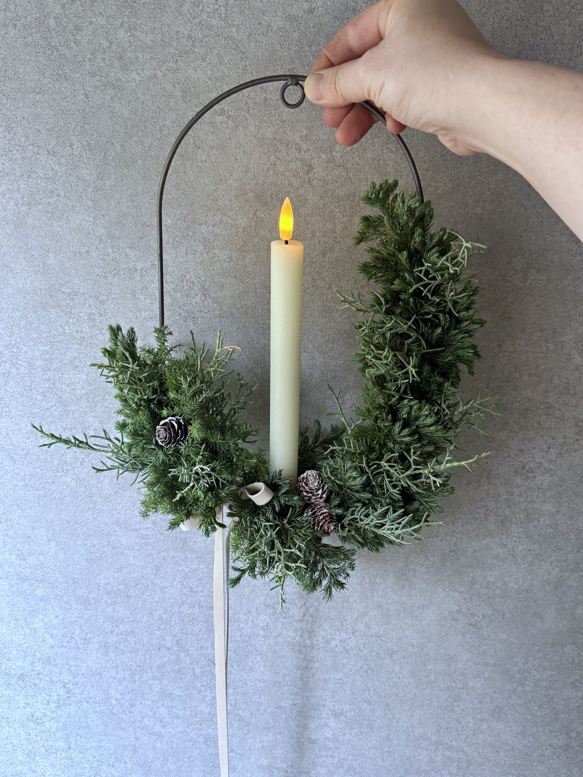 LEDキャンドル付きのしっかりとしたアイアンベースに、シルバーグリーンが美しいコニファー(ブルーバード、ブルーアイスなど)を巻き付けています。