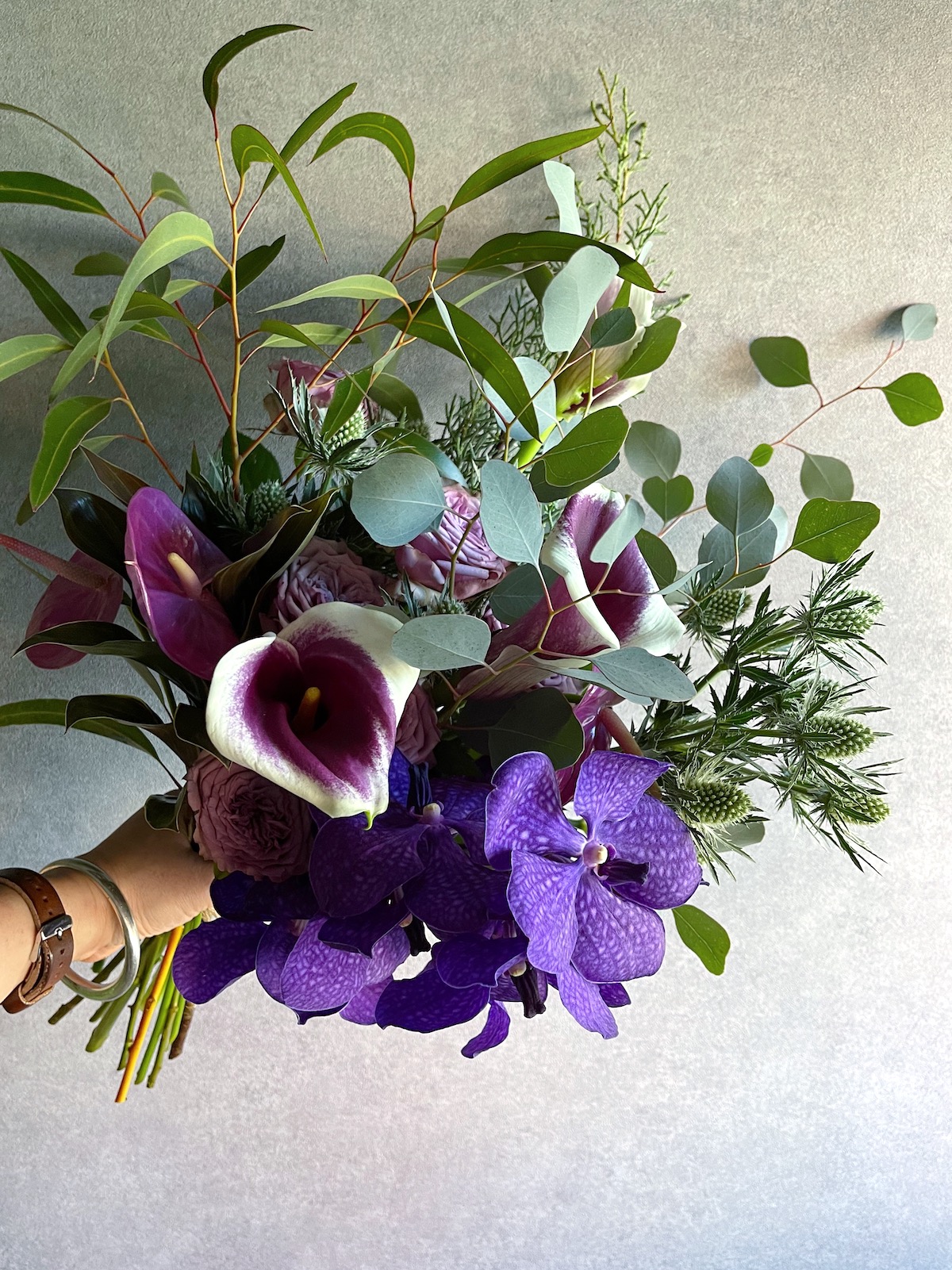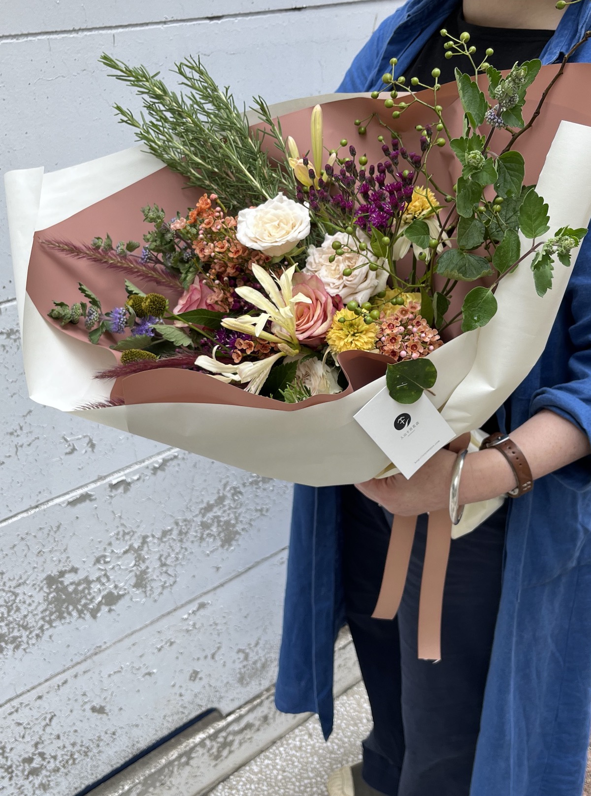 入山十百花店らしい花合わせで季節の花を束ねます。