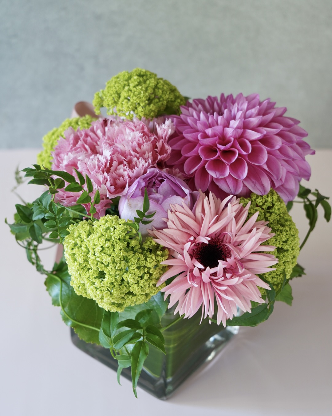 今年のMother’s Day 企画商品はスクエアのガラス花器に華やかなピンクの花々をキュッと詰め込んだ