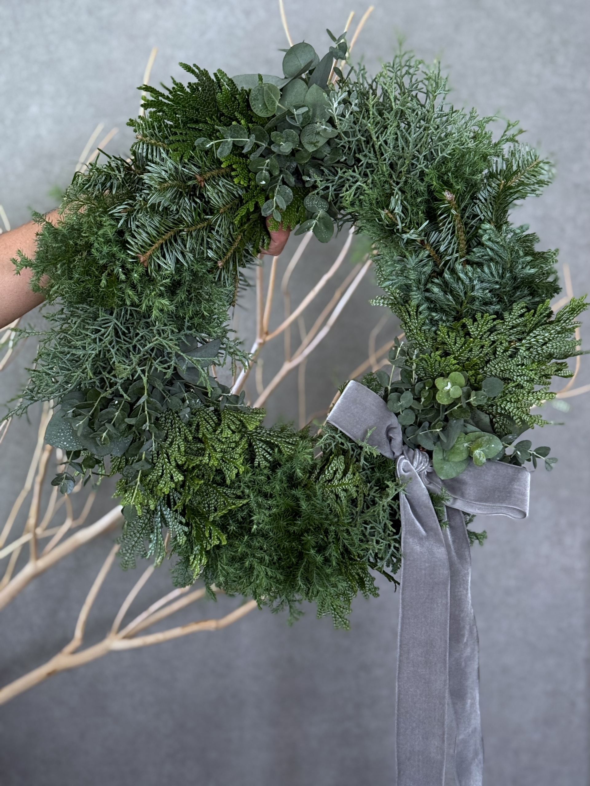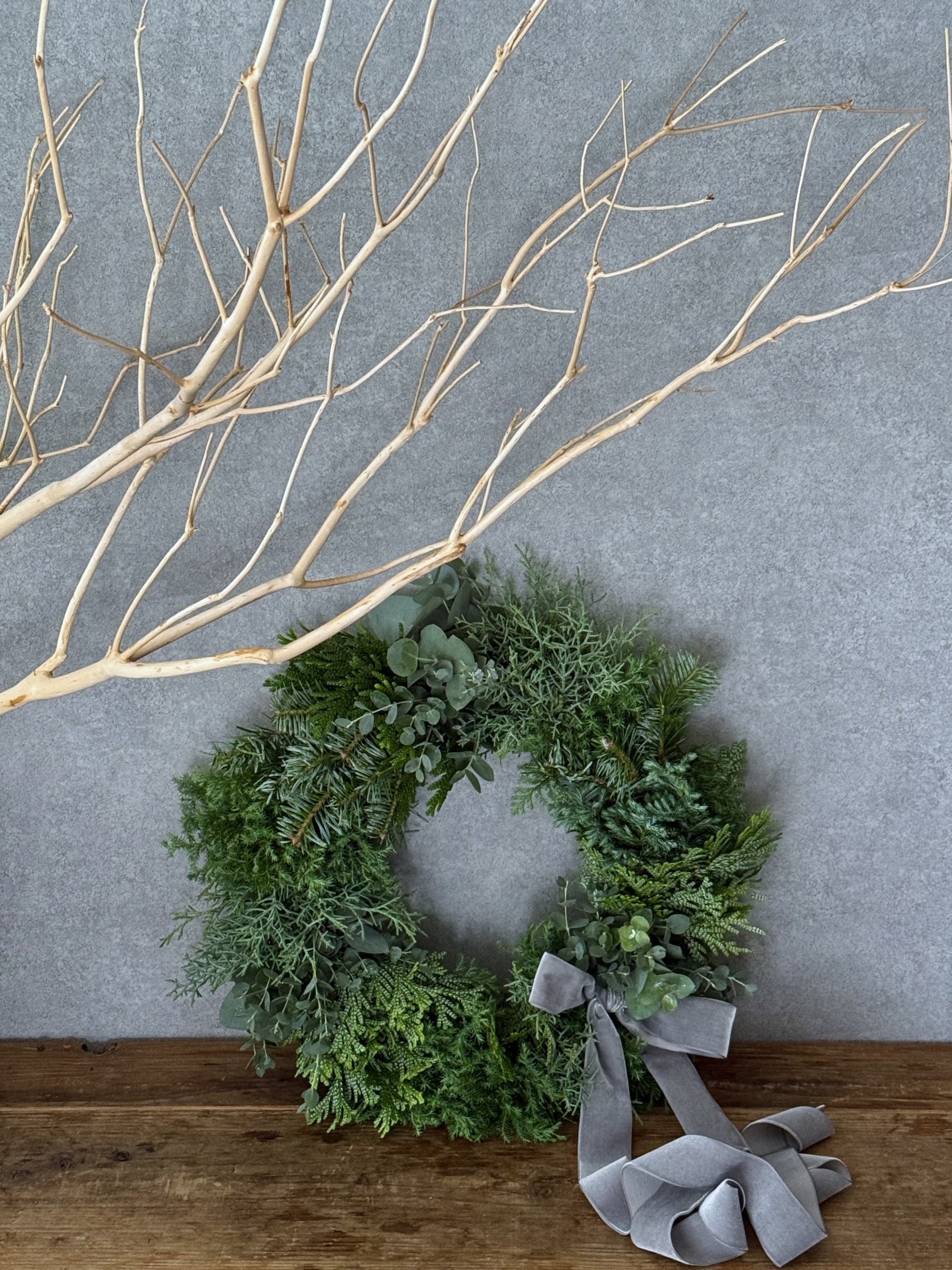 あえて実物等は入れずに、数種類の針葉樹やモミやユーカリなどを使ってシンプルでシックなリースを。